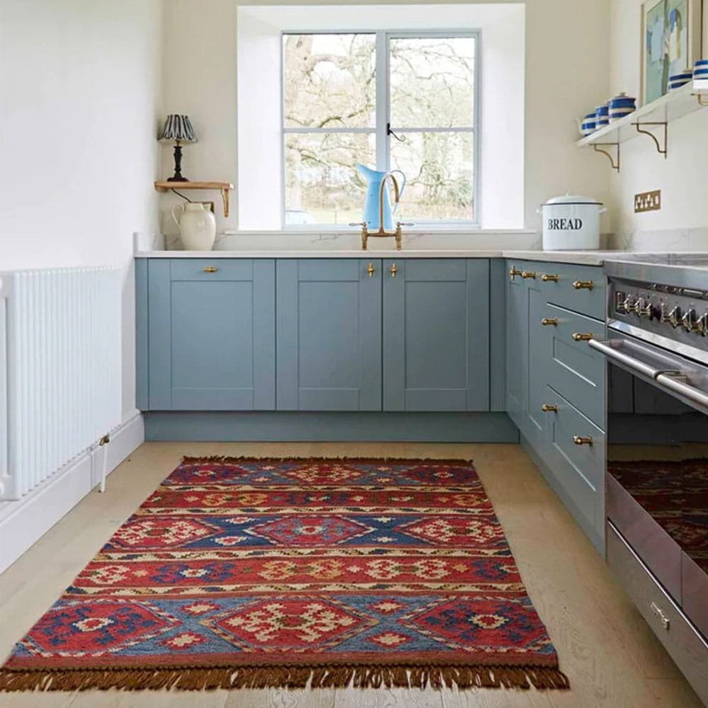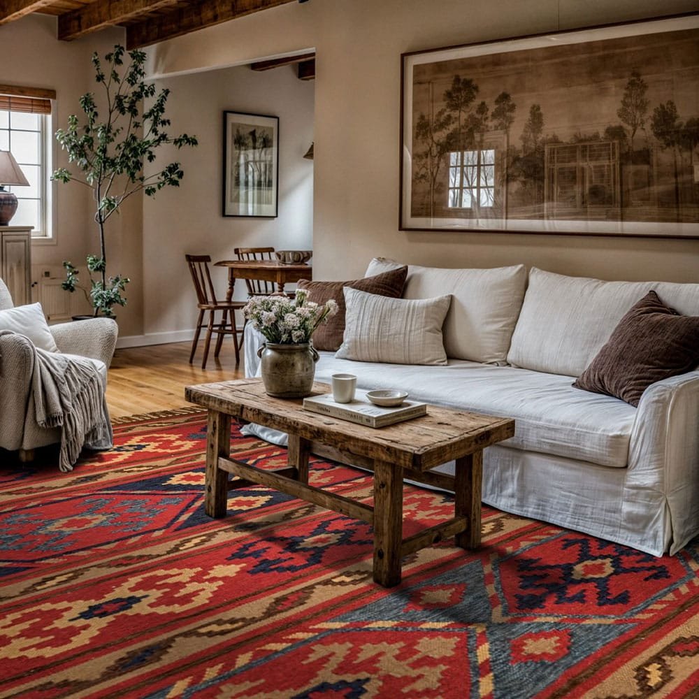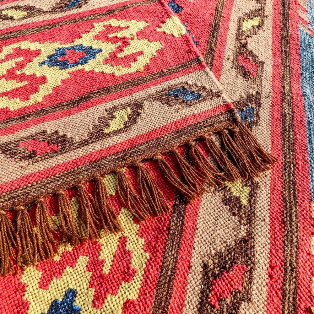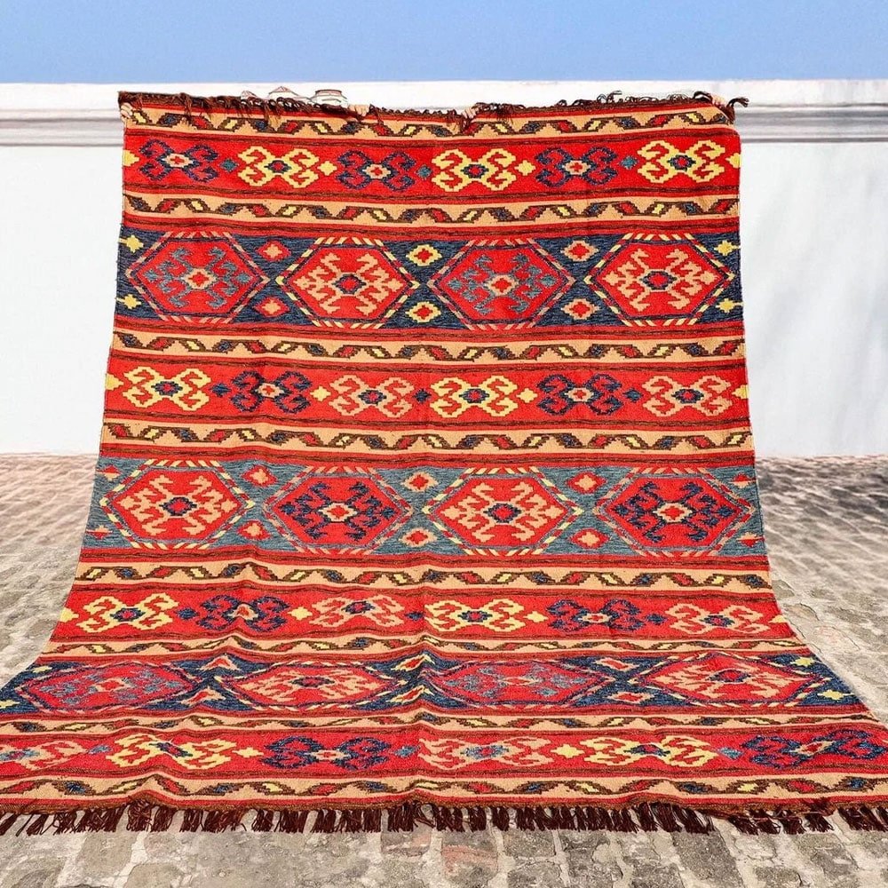 Förvandla ditt rum med den tidlösa charmen hos denna antika kelimmatta i turkisk stil. Den är handvävd av hållbart PET-garn och har ett fängslande geometriskt mönster i varma jordnära toner. Denna slitstarka och lätta matta är perfekt för att skapa en mysig och inbjudande atmosfär i alla rum och är ett miljömedvetet val som förbättrar din heminredning.