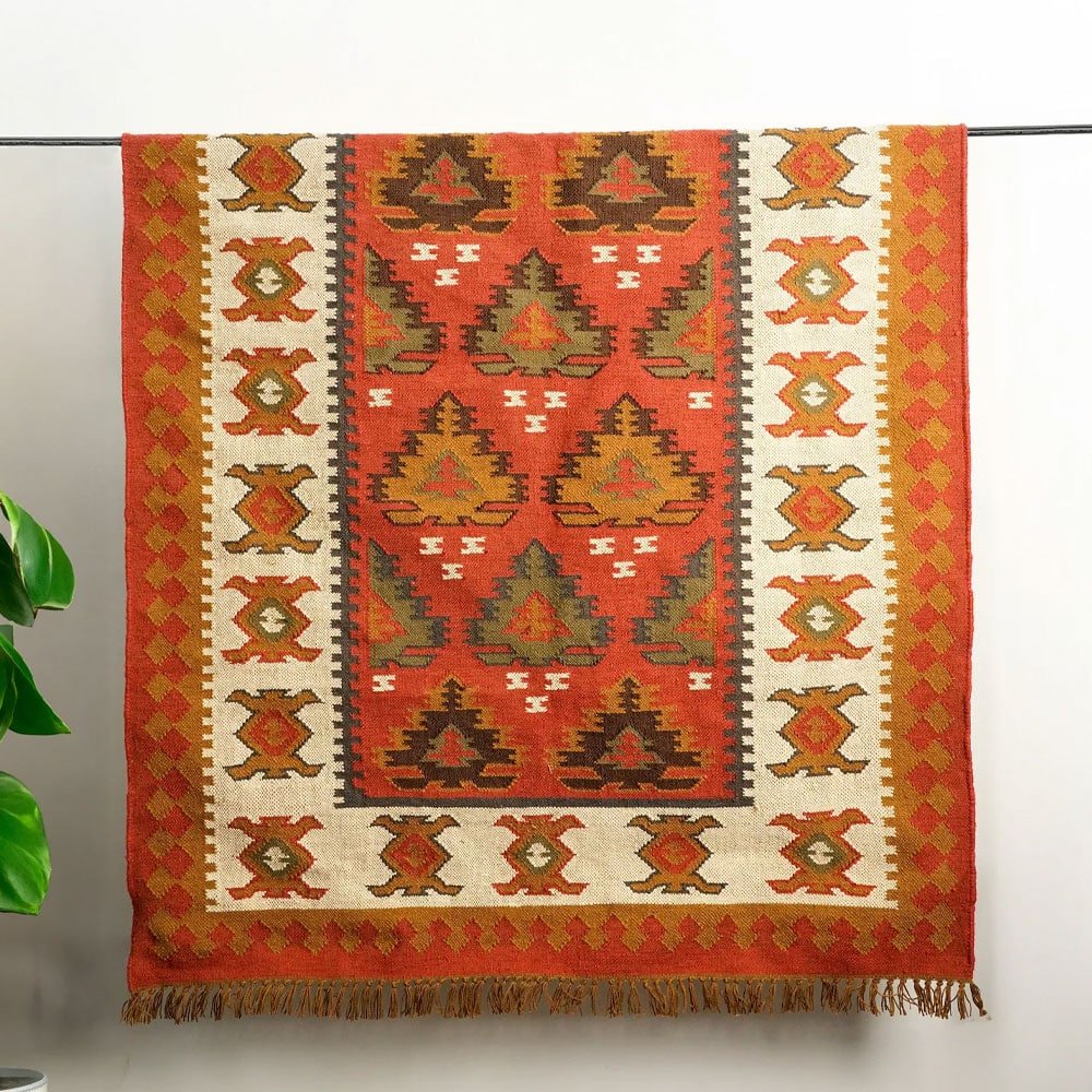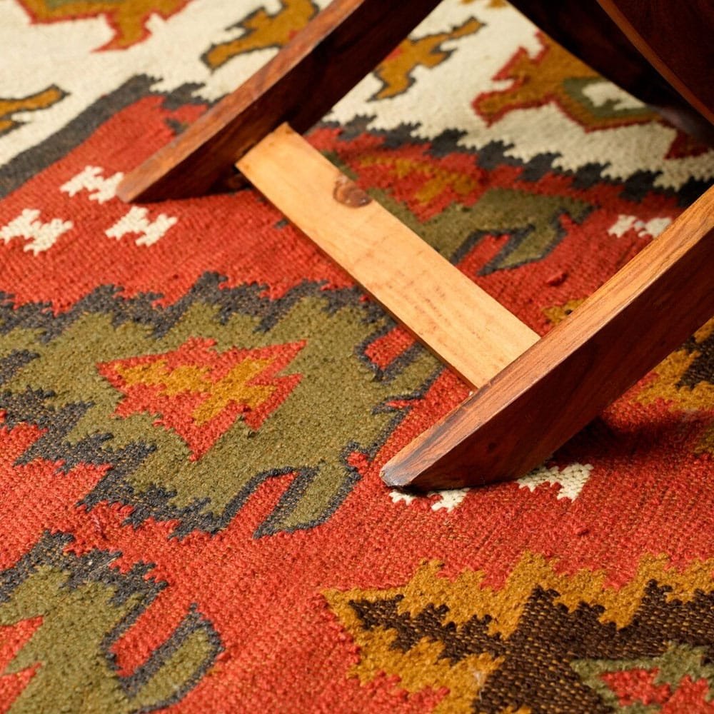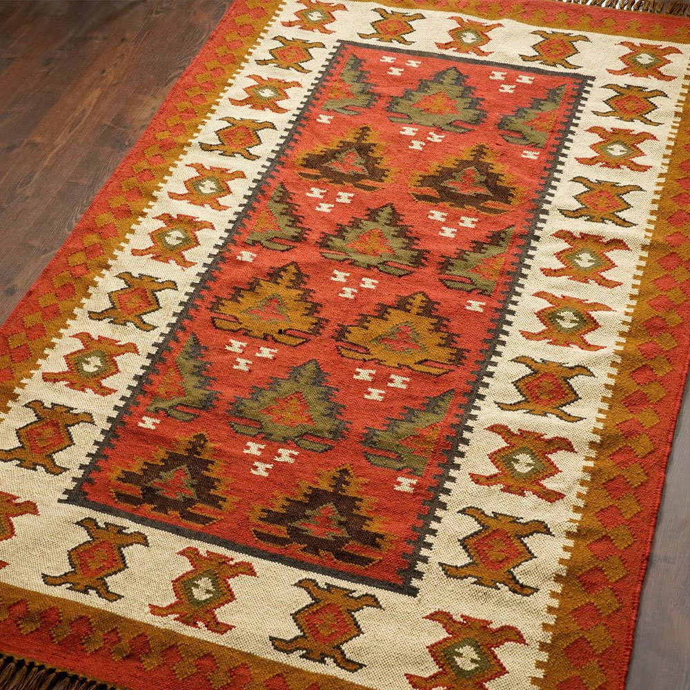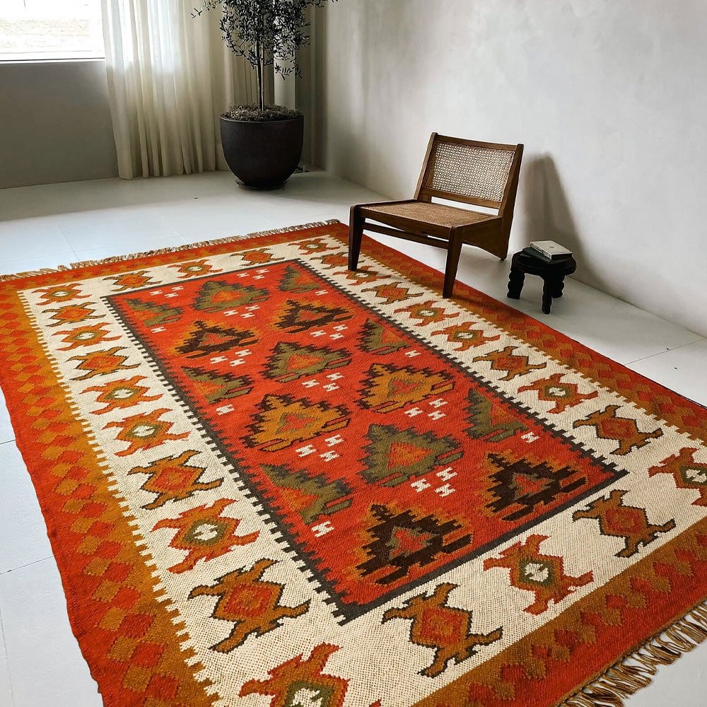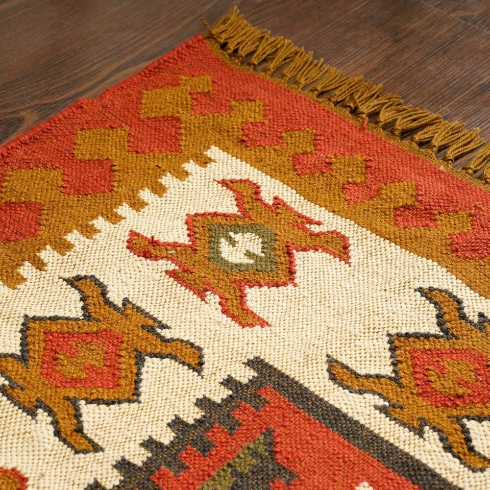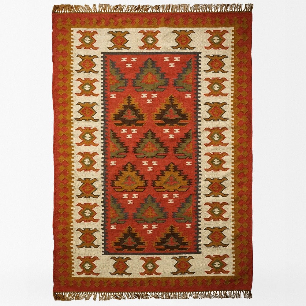 Ge ditt rum en touch av hållbar sofistikering med denna julinspirerade indiska kilim-matta. Det geometriska mönstret i varma jordnära toner är handvävt av återvunnet PET-garn och ger en mysig och välkomnande känsla till alla rum. Perfekt för att ge en unik karaktär till ditt vardagsrum, sovrum eller entré.