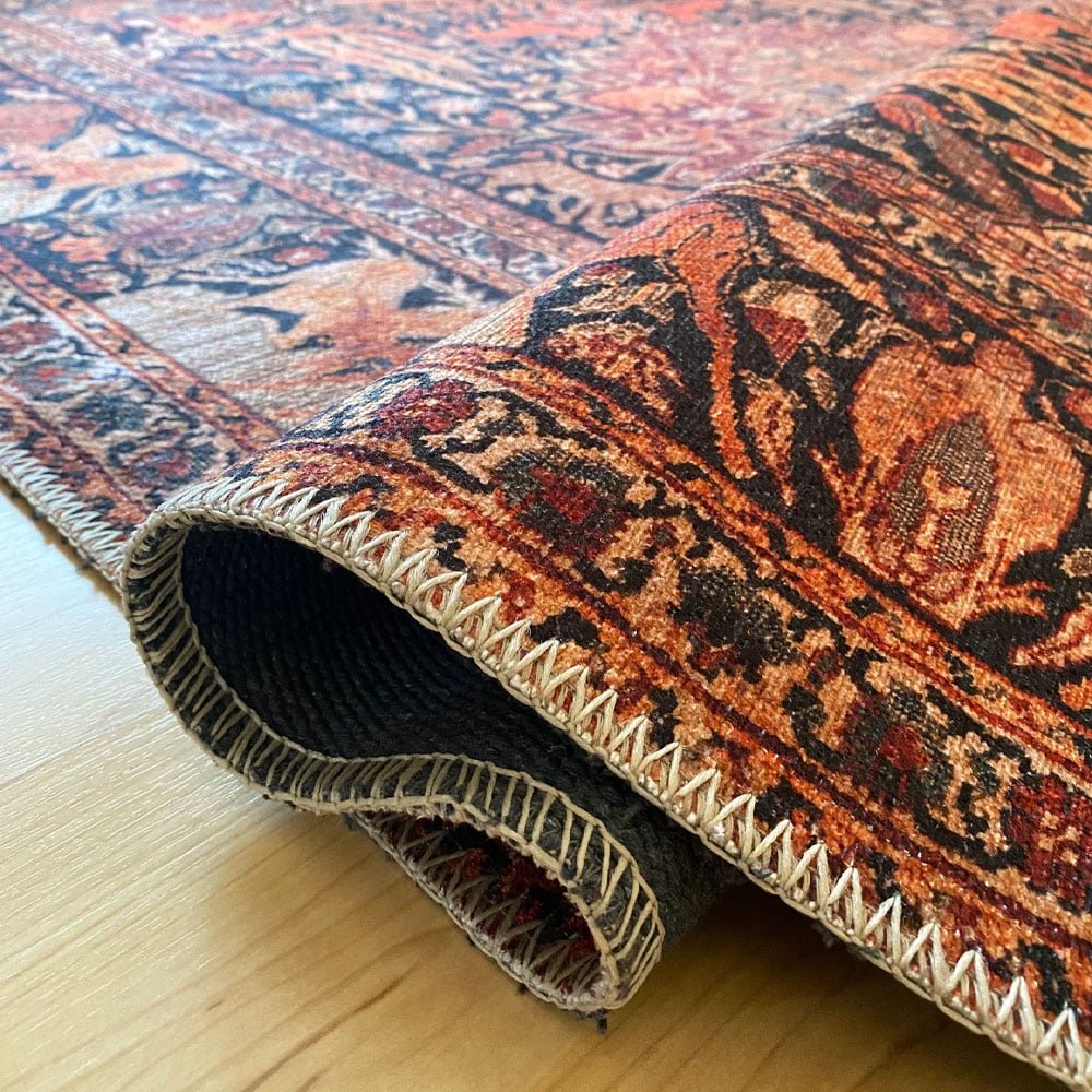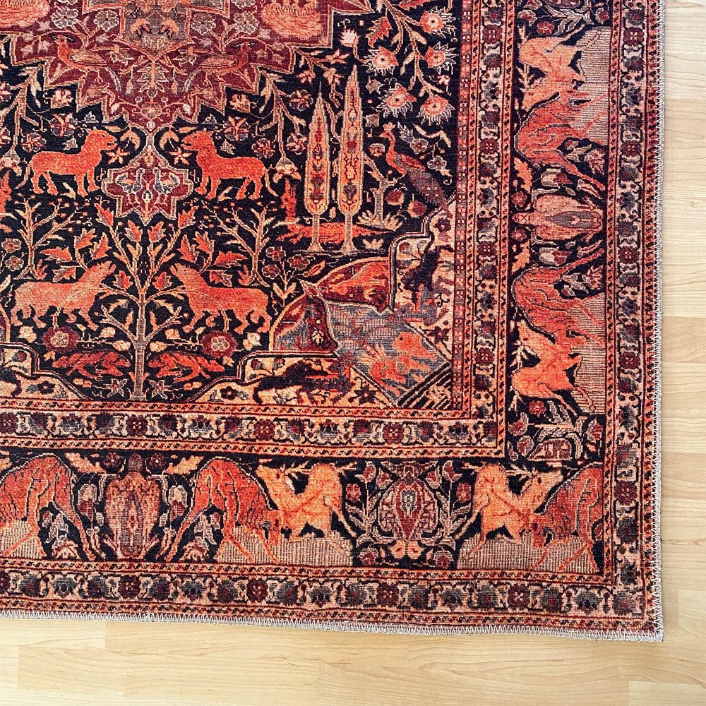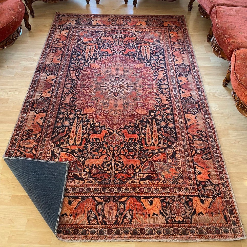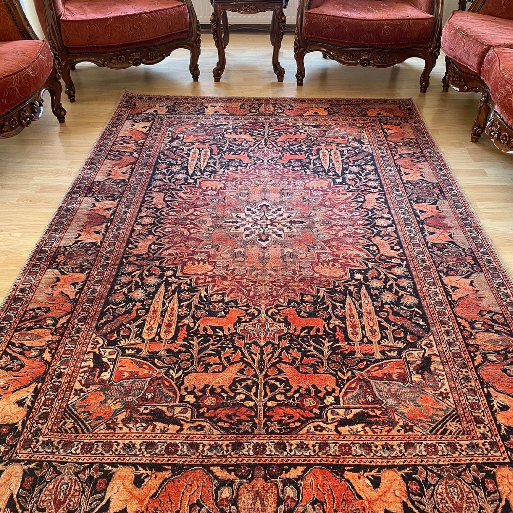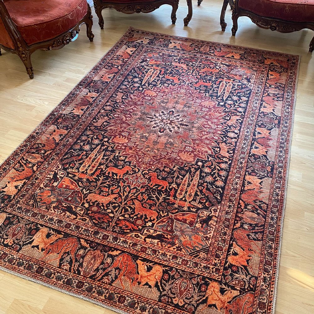 Förvandla ditt hem med vår tvättbara matta i persisk stil med djurmönster, ett fantastiskt mästerverk som är utformat för att tillföra etnisk charm i alla rum. Mattan är tillverkad av ren bomull med en mjuk, silkeslen touch och har livfulla färger och intrikata detaljer som aldrig bleknar. Den är idealisk för alla utrymmen och har en halkfri bas för extra komfort. Perfekt för dem som söker en blandning av historia och elegans i sin inredning.