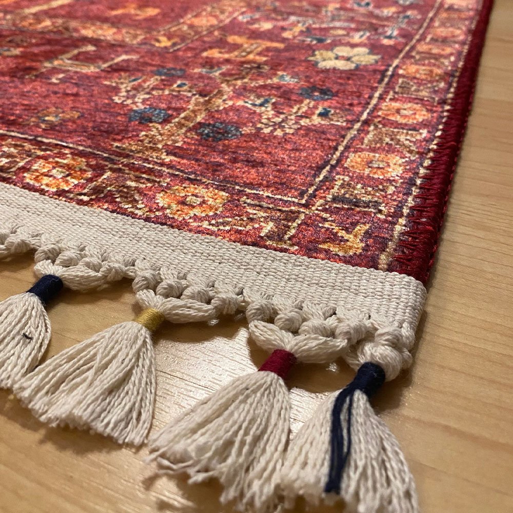 Förvandla ditt hem med denna utsökta tvättbara matta i röd Sultani-stil, utformad med invecklade turkiska och anatoliska motiv. Mattan är tillverkad av ren bomull och har en mjuk, silkeslen känsla och livfulla färger som inte bleknar. Den halkfria basen är idealisk för alla rum och garanterar komfort och säkerhet, medan det enkla underhållet gör den perfekt för en hektisk livsstil.