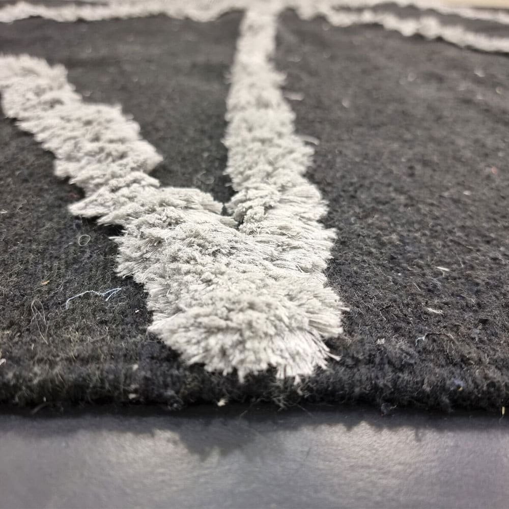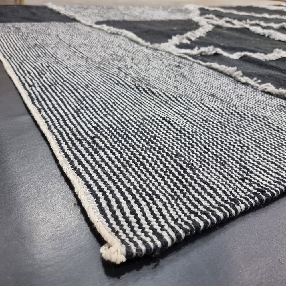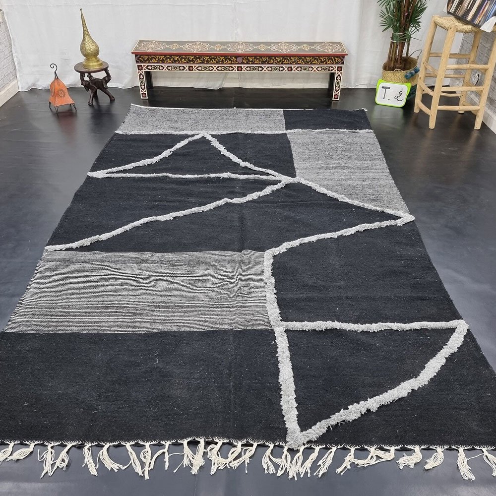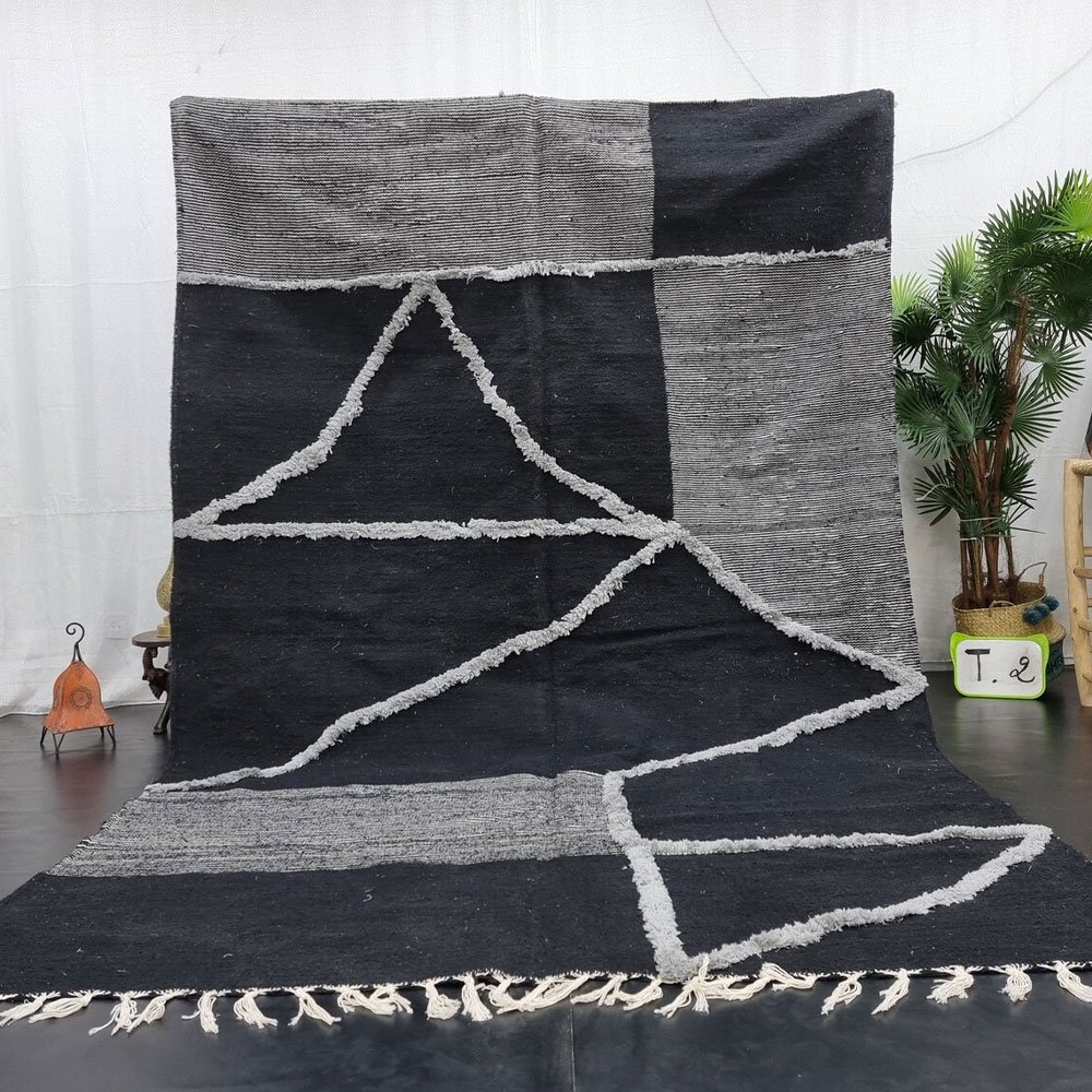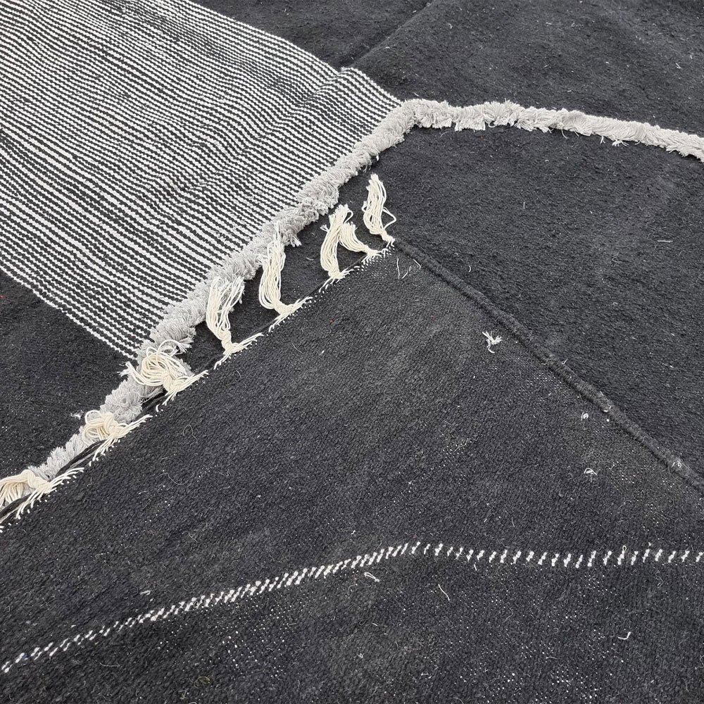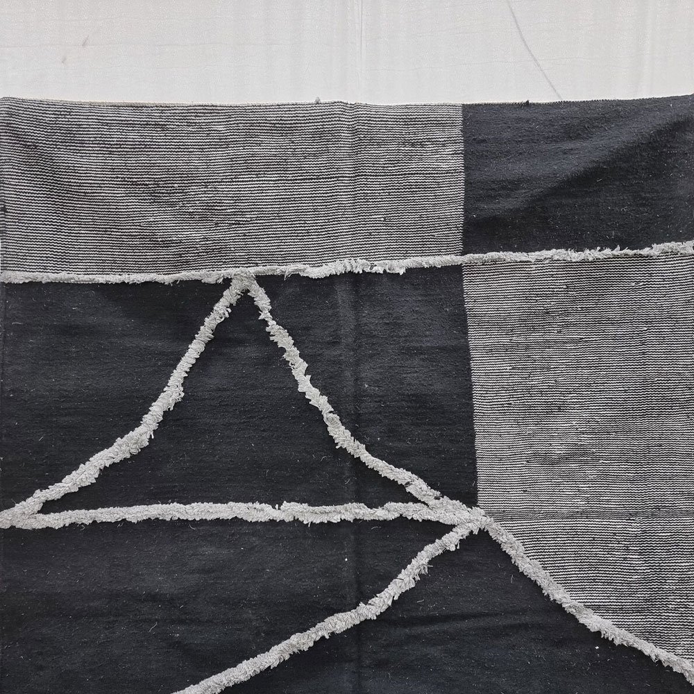 Lyft ditt hem eller showroom med den autentiska charmen hos Black Zanafi marockansk kilimatta. Varje del är handvävd av skickliga hantverkare från Zanafi-stammen och har intrikata geometriska mönster och naturliga motiv som smälter sömlöst med neutrala och medelhavsstilar. Denna matta är tillverkad av högkvalitativ fårull och lovar att ge värme och sofistikering till alla miljöer.